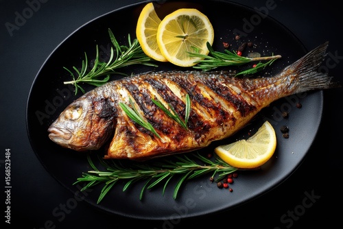 Whole Fish Dish: Grilled Delight on Black Plate Garnished with Lemon and Rosemary