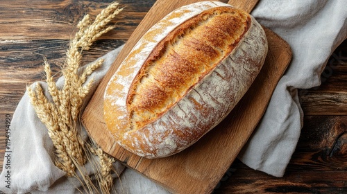 Whole Grain Bread on Wooden Board Surrounded by Linen Cloth and Wheat Sprigs Top View Rustic Bakery Scene