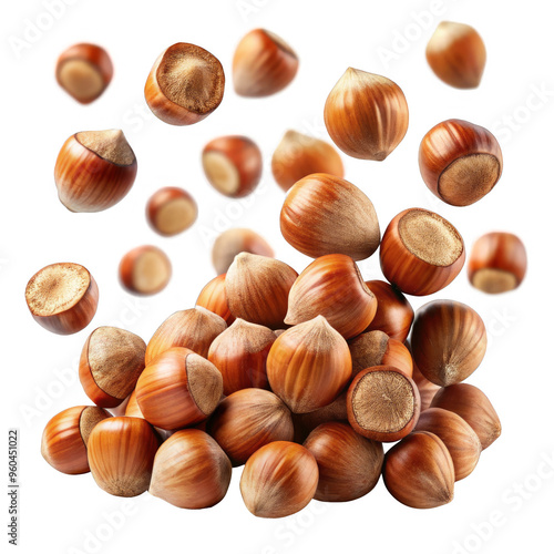 Whole hazelnuts falling and piled on white background, perfect for healthy snack and natural food concepts