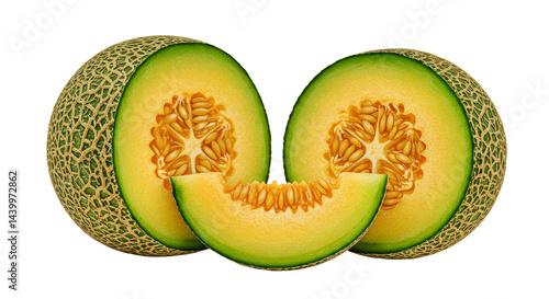 Whole Musk Melon Cross-Section Slice Isolated Transparent Background PNG Bright Fresh Detail Cantaloupe