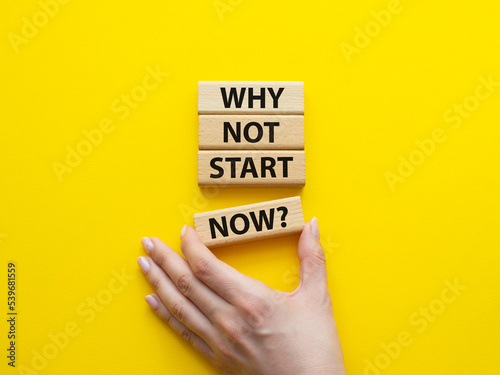 Why not start now symbol. Concept words Why not start now on wooden blocks. Beautiful yellow background. Businessman hand. Business and Why not start now concept. Copy space.