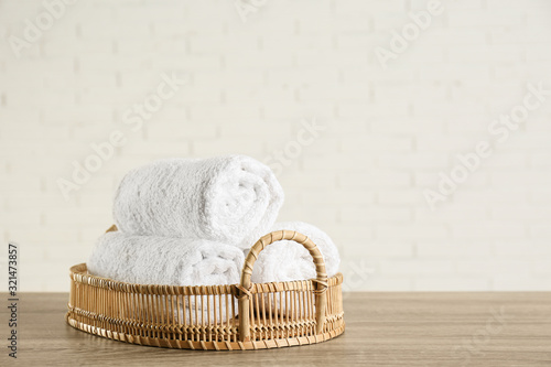 Wicker basket with rolled bath towels on wooden table near white brick wall. Space for text