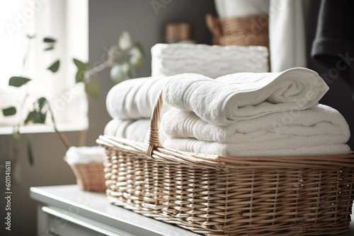 Wicker baskets with clean white towels on white counter top table with beautiful morning sunlight