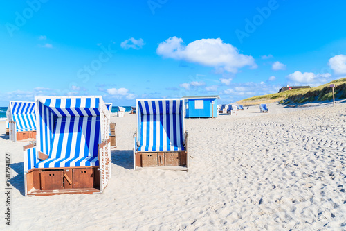 Wicker chairs on sandy beach in Kampen village on Sylt island, North Sea, Germany