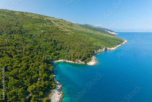Wide aerial view of untouched forested coastline and small hidden coves along the crystal-clear Adriatic Sea. Beautiful Croatian nature