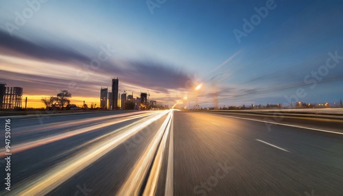 wide angle photo of a city road with a speed blur in the evening.road, highway, sky, travel, landscape, asphalt, sunset