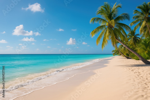 Wide angle photograph pristine tropical beach soft white sand turquoise water gentle waves palm trees leaning to sea bright sunny sky fluffy clouds no people peaceful inviting atmosphere
