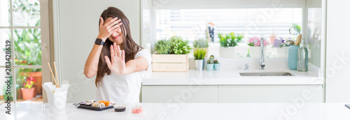 Wide angle picture of beautiful young woman eating asian sushi from delivery covering eyes with hands and doing stop gesture with sad and fear expression. Embarrassed and negative concept.