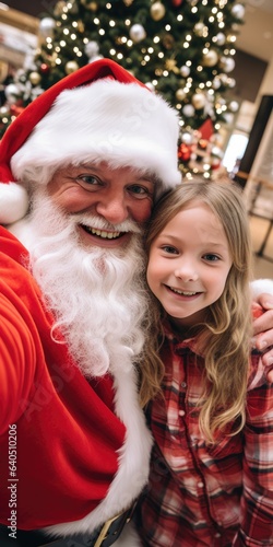 wide angle selfie picture taken with a smart phone of a happy little girl and santa claus looking at the camera inside a shopping mall