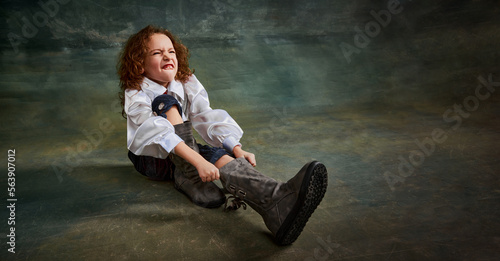 Wide angle view of little cute kid with curly hair sitting on floor over dark green background. Concept of childhood, comparison of eras, retro, vintage, emotions
