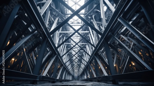 Wide Angle View of Steel Structure Featuring Intricate Beams and Framework in Industrial Setting with Ambient Lighting Effects