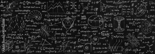 Wide board with scientific formulas and calculations in economics and mathematics. Scientific and educational background.