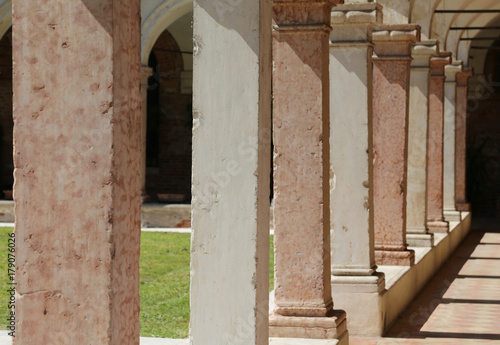 wide colonnade of a cloister iand the shadows n the ancient conv