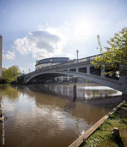 Wide concrete arch bridge spanning a river, reflecting in the water, and trees on the bank.
