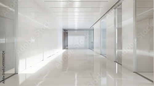 wide empty white walls in a hallway in a modern office with bright natural light and neutral tones