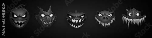 Wide Halloween face icons in black and white with detailed scary smiles and eyes.