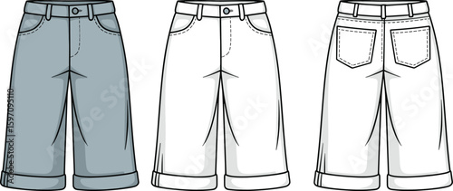 Wide leg denim pants, cuffed hem jeans CAD, front and back view, flat sketch template, technical vector apparel illustration