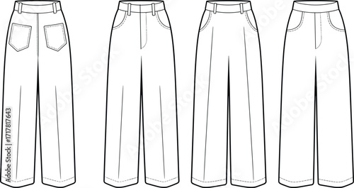 Wide leg pants flat sketch, fashion technical drawing, vector template with front and back view, unisex casual trousers design illustration