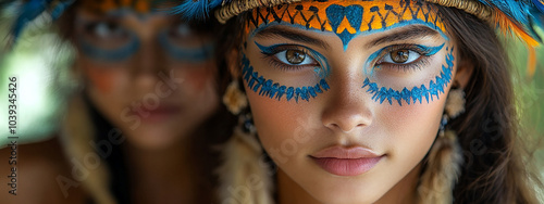 wide macro closeup photo of a woman face with highly detailed skin, face paint with blue and yellow colors and she looking at the camera directly with sharp eyes