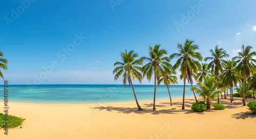 Wide Panorama of Tropical Beach with Turquoise Sea and Coconut Palm Trees
