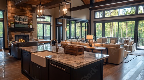 Wide photo: Openly flowing modern interior living room with bright nature views. AI Generated