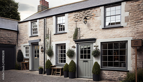 Wide shot Exterior photo of Medium Stylishly renovated Mews house In the UK With Modern Farmhouse Style interiors Showing from windows and big glass door.