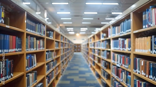 Wide shot of a long library aisle with bookshelves full of books. Concept of education, knowledge, and research.
