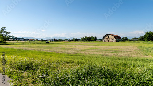 Wide Shot Of Green Rural Farmland With Barn Under Sunny Sky