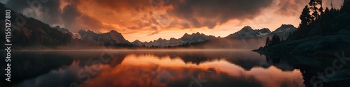 Wide shot of Moraine Lake at sunrise. with the Valley of Ten Peaks glowing under fiery orange skies. in 4K resolution