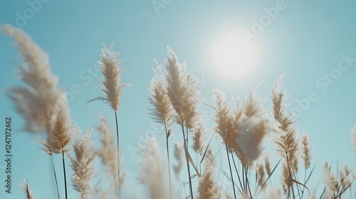 Wide shot of reeds swaying in the wind against a blue sky