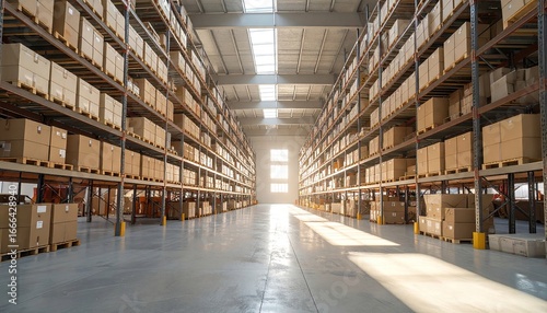 Wide View of a Bright Warehouse with Tall Storage Racks Filled with Cardboard Boxes