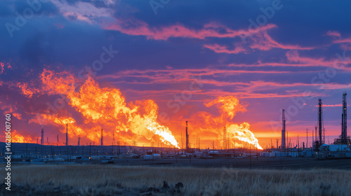 Wide view of oil field ablaze at twilight, fiery plumes licking the sky as blackened industrial structures stand starkly outlined against the burning horizon