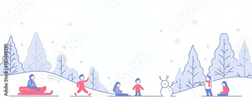 Wide winter banner. Winter scene with children playing in snow and a snowman in a snowy landscape.