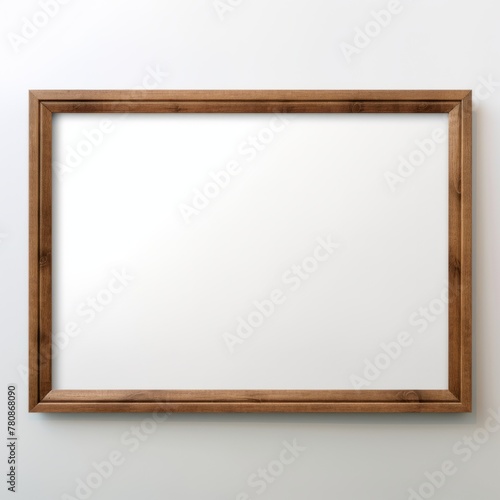 Wide wooden picture frame on a light wall, realistic mockup for artwork or photograph presentation