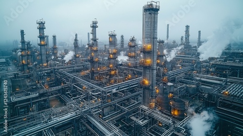 Wide-angle aerial shot of an oil refinery showing distillation towers, storage tanks, and complex pipelines. Capturing the layout and scale of an oil refining facility.
