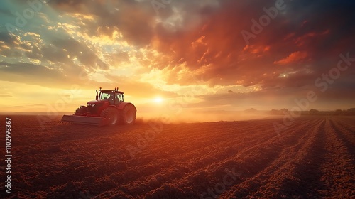 Wide-angle shot of a tractor plowing an endless field, soil being overturned with precision, sun rays piercing through clouds, vibrant colors, dynamic composition, photorealistic finish, hd quality.