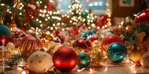 Wide-angle shot of several Christmas ornaments scattered across a table, surrounded by other festive decorations, including garlands, tinsel, and strings of glowing lights.
