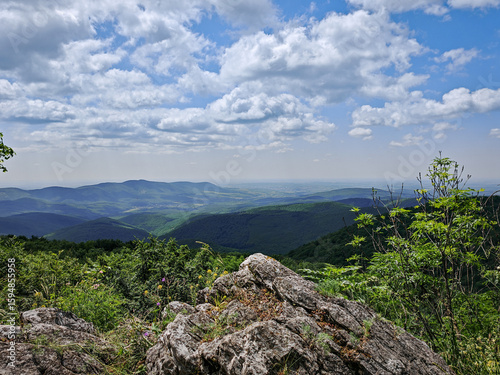 Wide-angle view from Pes-kő in the Bükk Mountains, overlooking the lush green ridges and the valley below, with Eger and Felsőtárkány visible in the distance.