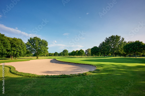 Wide-angle view of a golf green with flagstick, trees, and bunker under a vibrant blue sky. Perfect for nature, leisure, and outdoor sport themes.