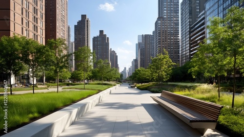 Wide-angle view of an urban park with lush greenery, benches, and tall buildings in the background. modern city living and relaxation