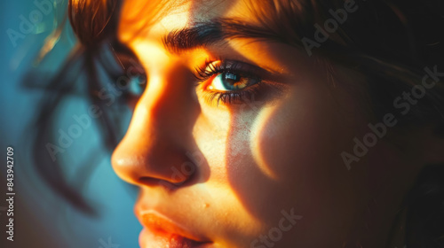 Wide-eyed person in warm dimly lit room realizing something