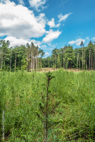 Wiederaufforstung im Mischwald im Frühjahr