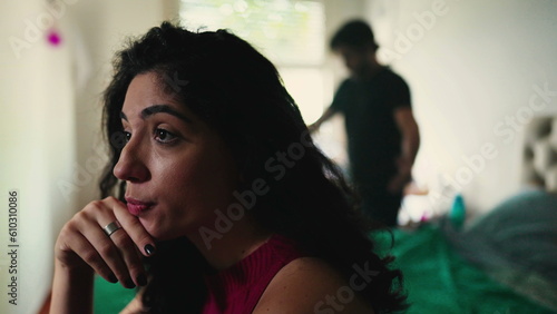 Wife Cynically Rolls Eyes as Husband Yells and Gestures in Background During Relationship Argument