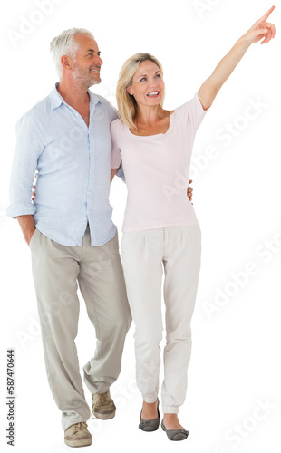 Wife showing upwards to husband while walking
