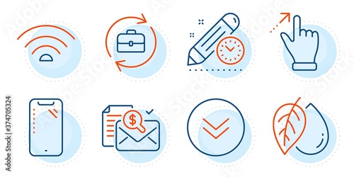 Wifi, Human resources and Smartphone signs. Accounting report, Project deadline and Touchscreen gesture line icons set. Mineral oil, Scroll down symbols. Check finance, Time management. Vector