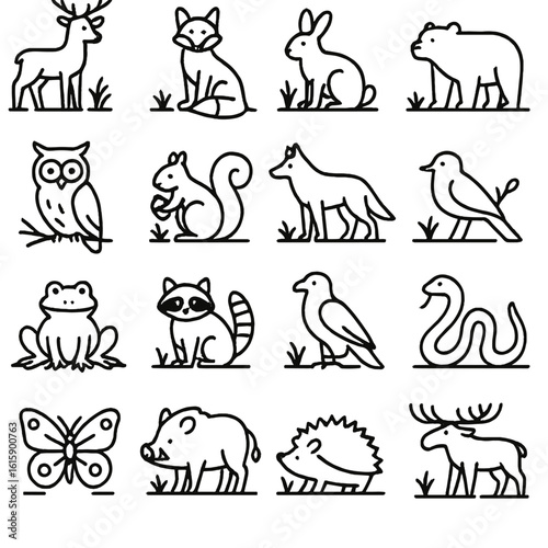 Wild Animal Icons. Line style icons of wild animals in nature: deer, fox, rabbit, bear, owl, squirrel, wolf, bird, frog, raccoon,
