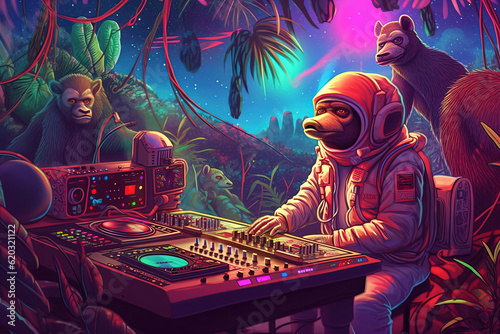 Wild Beats: Vibrant Animal Disc Jockey Illustration, ai