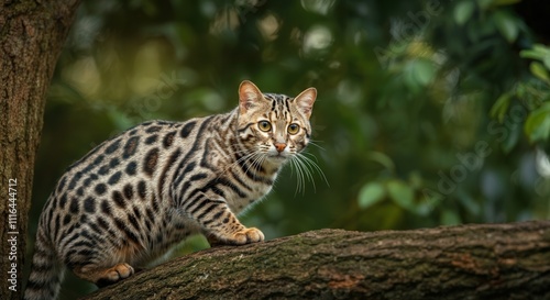 Wild bengal cat exploring forest habitat on tree trunk under canopy