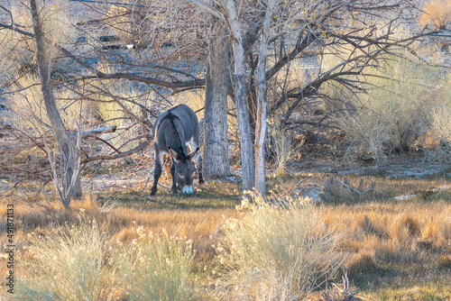 Wild Burro eating grass in the Southern Nevada desert in Beatty Nevada near Las Vegas.