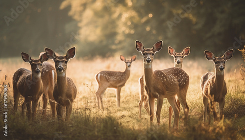 Wild deer herd grazing in African savannah at sunset generated by AI